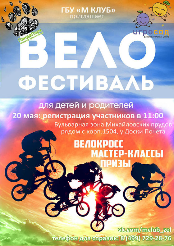 Весенний детский велофестиваль состоится 26 мая на бульварной зоне Михайловских прудов, напротив ТЦ «Столица». Участников ожидают слалом и велокросс на 250 метров, предусмотрен отдельный заезд для мам с колясками. Всех участников ожидают подарки от ПандаПарка и ИгроСада. Начало регистрации в 11:30, старт заездов в 12:00.