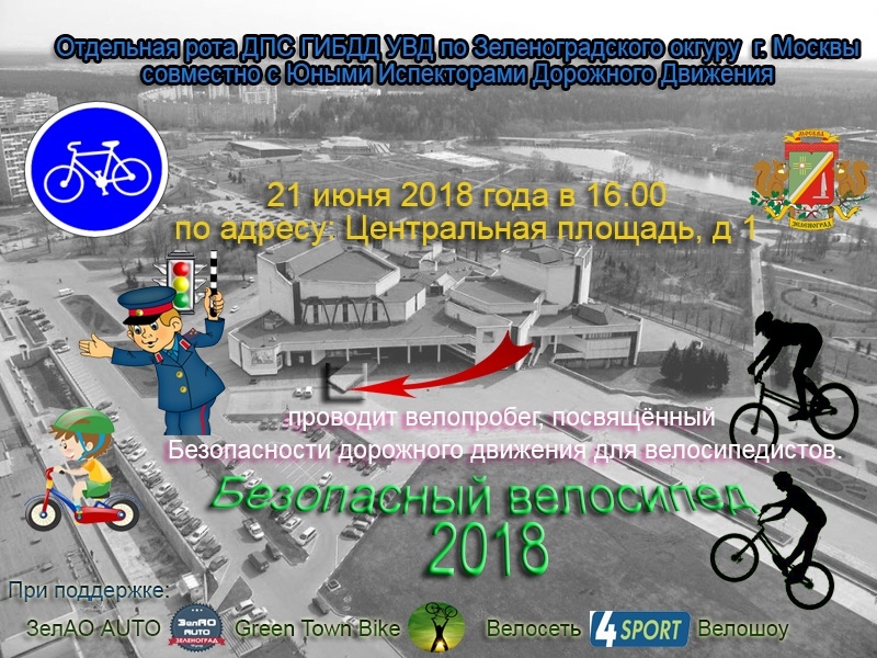21 июня в 16:00 на Центральной площади около КЦ «Зеленоград» (ДК) состоится велопробег, посвященный безопасности дорожного движения для велосипедистов. В программе: велопробег и выступления по велотриалу. Приглашаются все желающие. Возраст не ограничен. Сбор у сцены.