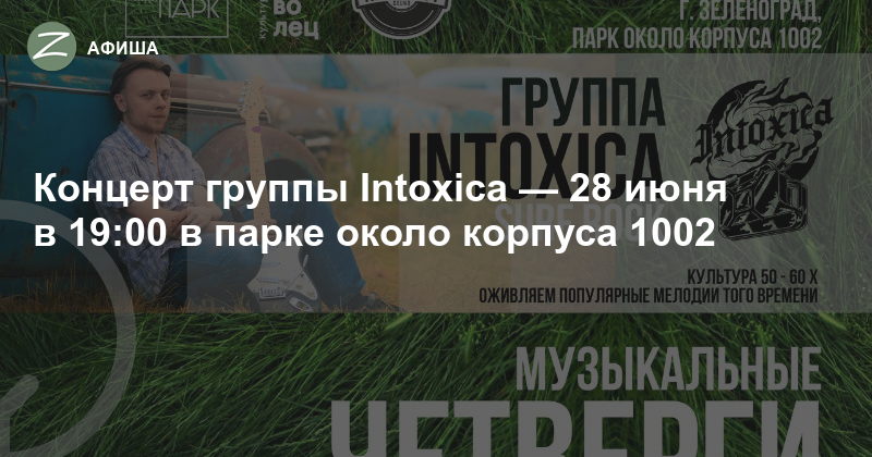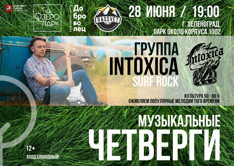 В четверг 28 июня на территории Озеропарка (Школьное озеро), возле корпуса 1002 состоится концерт группы Intoxica. Стиль группы: сёрф рок. Начало в 19:00. Вход свободный.