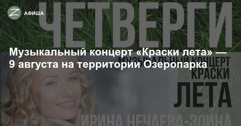 9 августа в 18.00 на территории «Озеропарка» (корпус 1002) состоится концерт «Краски лета» певицы и руководителя детской вокальной группы «Голос Ангела» Ирины Нечаевой — Зоиной. Приглашаются все желающие. Вход свободный.