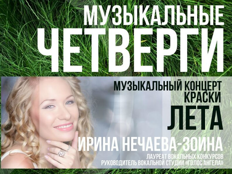 Ирина Нечаева-Зоина — певица с большим опытом выступлений на различных мероприятиях: фестивалях, концертах, конкурсах. В репертуаре певицы: песни российской и зарубежной эстрады, ретро, песни из к/ф, романсы, русские народные песни. Красивый голос, профессиональное исполнение в сочетании с теплом и душевностью подарят вам хорошее настроение и праздник.