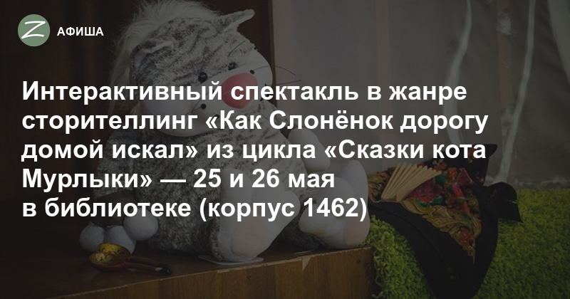 Интерактивный спектакль в жанре сторителлинг «Как Слонёнок дорогу домой искал» из цикла «Сказки кота Мурлыки» покажут в Библиотеке театра и кино №252 (корпус 1462) 25 и 26 мая в 11:00. Как известно, маленькие слонята — самые вежливые и послушные дети в Саванне. Потому и держатся во время прогулки хоботом за мамин хвост, чтобы не потеряться. Ведь найти дорогу домой малышам совсем не просто… Но что делать, если ты все-таки заблудился? Новый друг кота Мурлыки оказался храбрым, добрым и сообразительным Слонёнком, и благодаря помощи других смог отыскать дорогу домой. Как? Узнать можно от самого искусного рассказчика — кота Мурлыки! «Сказки кота Мурлыки» — это, прежде всего, игра, подкреплённая повествованием от лица разных персонажей. Рекомендуемый возраст зрителей — от 3 лет. Вход платный: 500 рублей для каждого посетителя старше двух лет.