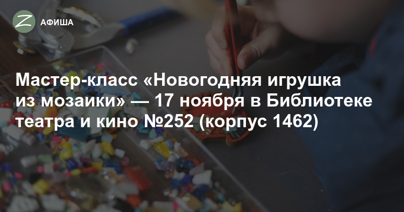 Мастер-класс «Новогодняя игрушка из мозаики» состоится 17 ноября в библиотеке театра и кино №252 (корпус 1462), на нём участники познакомятся с декорированием игрушки мозаикой. Стоимость мастер-класса 500 руб (оплата картой). Количество мест ограничено. Регистрация по телефону.