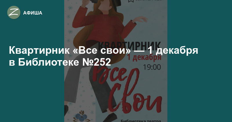 Любите ли вы посиделки в кругу друзей? Напеваете ли вы песни под гитару, услышав знакомый мотив? Если на оба вопроса вы ответили «Да!», то вам обязательно нужно побывать в уютной компании, где Все Свои. 1 декабря «Все Свои» соберутся вновь в Библиотеке театра и кино №252 (корпус 1462), чтобы встретить первый зимний вечер и дать отпор холодам. Начало в 19:00. Стоимость билета: 300 руб.