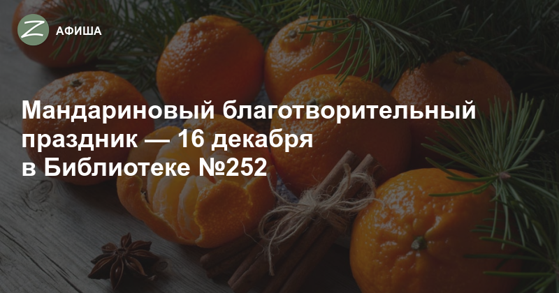 16 декабря в Библиотеке театра и кино №252 (корпус 1462) состоится Мандариновый благотворительный праздник, который подготовили Библиотеки Зеленограда совместно с группой волонтерской помощи «Чайка» Храма святого благоверного великого князя Александра Невского. Гостей праздника ждет уютное «ламповое» пространство с ярмаркой авторских вещиц и выпечкой, мастерскими по декупажу, скрапбукингу, изготовлению пальчикового театра и новогодних игрушек из фетра для детей. Начало в 15:00.