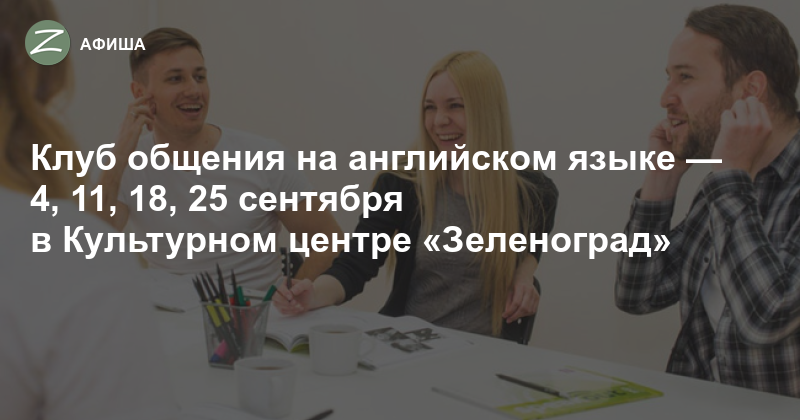 Культурный центр «Зеленоград» продолжает работу популярного Клуба общения на английском языке! На встречах вы сможете поддерживать ключевой навык — устное общение на английском на разнообразные темы, убирая языковой барьер, расширяя словарный запас, узнавая актуальные в современном общении фразы и обретая новые знакомства, которые позволят поддерживать English speaking дальше. Встречи пройдут 4, 11, 16, 23 сентября 2019 с 18:30 до 19:30. Вход свободный. Участие бесплатное, но предварительная онлайн-регистрация обязательна! Количество мест ограничено. Уровень английского: Intermediate и выше.