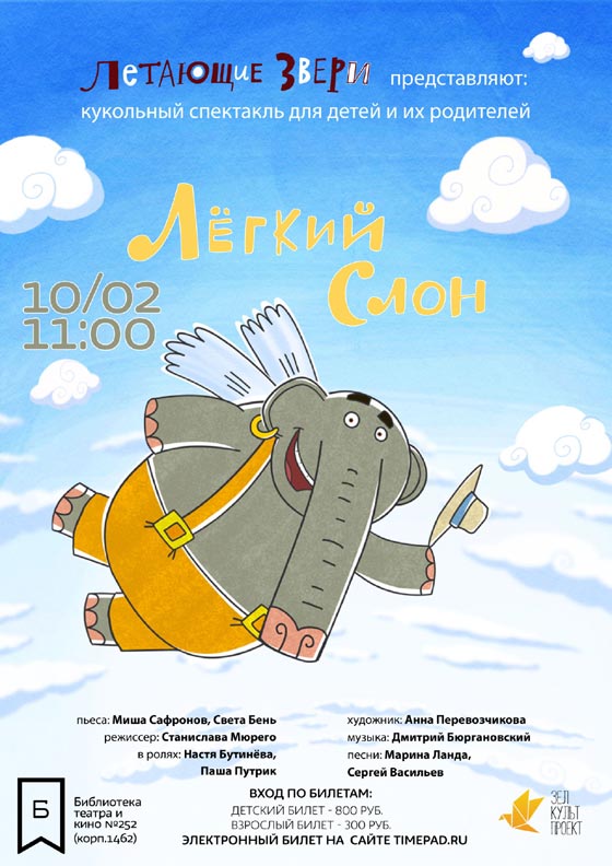 Библиотеки Зеленограда и ЗелКультПроект объявляет февраль месяцем Питерских театров в Зеленограде! В гости едет благотворительный медиа-бренд «Летающие звери» и театр «МюрегО» со спектаклем «Лёгкий слон». Спектакль «Легкий слон» научит летать и маленьких, и больших, и даже тех, кто весит больше тонны. Ведь самое главное, чтобы взлететь, не крылья, самое главное — счастье! Спектакль покажут 10 февраля в Библиотеке театра и кино (корпусе 1462). Начало в 11:00. Стоимость билетов: 800 рублей — детский, 300 рублей — взрослый, детский льготный (многодетным, инвалидам при предъявлении документа на входе) — 640 рублей. Часть средств со спектакля идёт на лечение тяжелобольных детей.