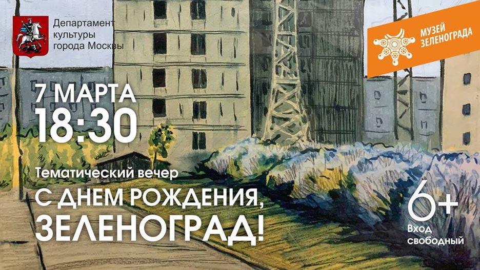 7 марта Музей Зеленограда (улица Гоголя, дом 11В) приглашает на тематический вечер посвященный Дню рождения Зеленограда. Вечер начнется с обзорной экскурсии по экспозиции «Страницы истории Зеленограда». Затем будут демонстрироваться документальные фильмы о городе. Вход свободный. Начало в 18:30.