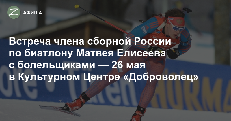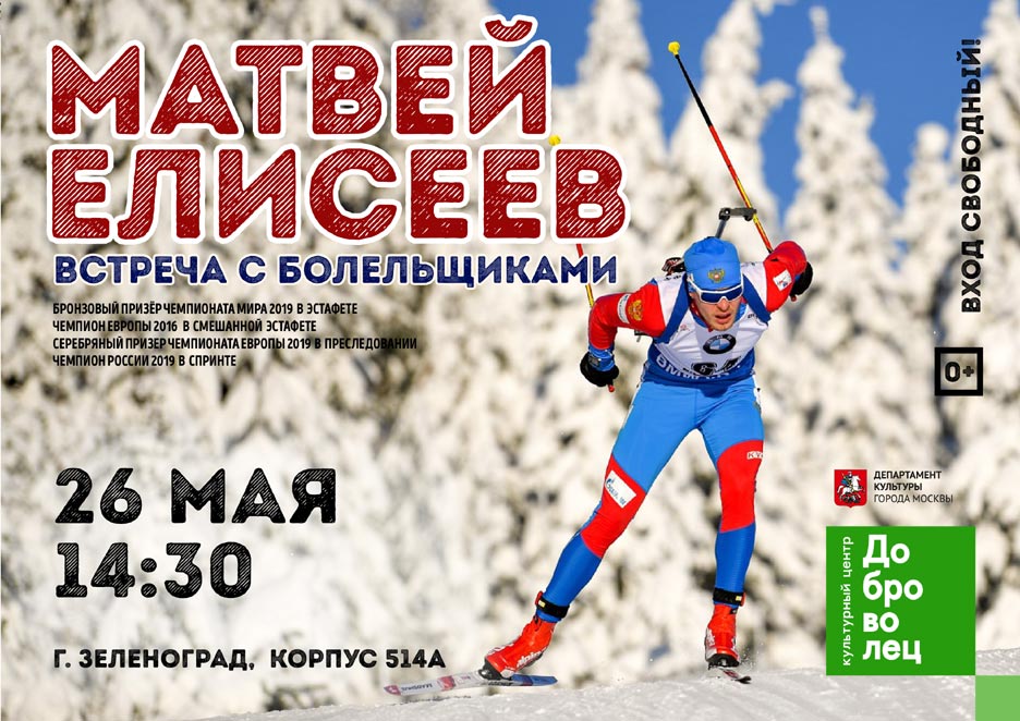 26 мая в 14:30 в Культурном центре «Доброволец» (корпус 514А) состоится встреча члена сборной России по биатлону Матвея Елисеева с болельщиками. У всех желающих будет возможность сфотографироваться со спортсменом, получить автограф и задать вопросы. Вход свободный, регистрация не требуется.