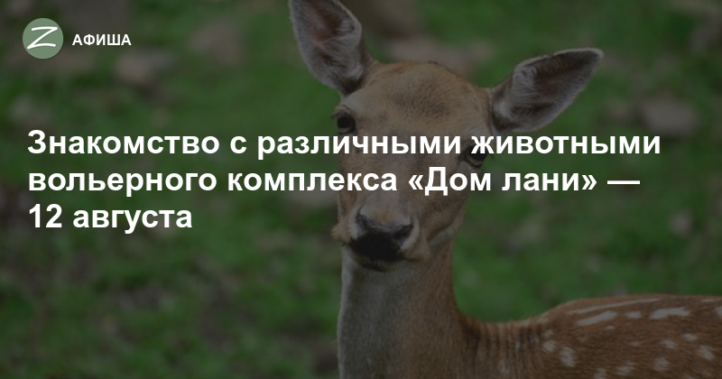 12 августа в 11:00 в вольерный комплекс «Дом лани» приглашают мальчишек и девчонок старше 6 лет на увлекательное и подробное знакомство с различными животными вольерного комплекса. Совсем недавно здесь родились новые питомцы — маленькие лани, и ребятам расскажут о них более подробно — что они кушают, как играют, как живут. Экскурсии проводятся еженедельно по предварительной записи: 8(499)735-55-56. Организаторы говорят — когда дети учатся любить природу и животный мир с самых ранних лет, они вырастают добрыми, искренними и любящими.