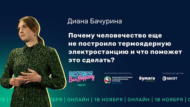 Этот вопрос пытаются решить ученые со всего мира, в том числе и Диана Бачурина. Она занимается, на первый взгляд, небольшой задачей — разрабатывает способ соединения вольфрама со сталью, но без этого термоядерной электростанции не будет никогда. Диана использует технологию высокотемпературной пайки — только без паяльника в руке. А как? Узнаем на Science Bar Hopping: МИЭТ!