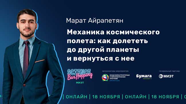 Как же долететь до другой планеты и вернуться обратно, какие физические законы лежат в основе космического полета и как рассчитывают траектории полета космических аппаратов? Об этом поговорим на Science Bar Hoping МИЭТ 18 ноября с инженером Маратом Айрапетяном.