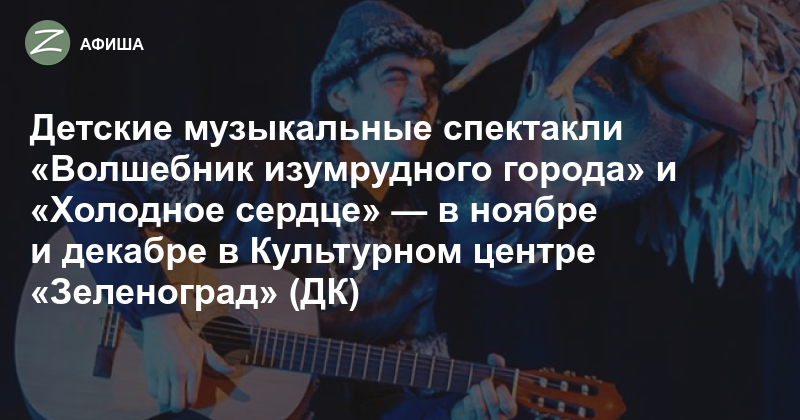 Целых два мюзикла по мотивам детских сказок покажут на сцене Культурного центра «Зеленоград» в ближайшее время — в ноябре Музыкальный театр имени Н. И. Сац привезёт сказку «Волшебник изумрудного города», а под новый год в зеленоградском ДК можно будет увидеть мюзикл «Холодное сердце». Зрителей ждут сказки, любимые поколениями детей и взрослых, яркое исполнение артистов крупных московских театров, современные визуальные эффекты, песни, танцы и приобщение к атмосфере праздника.
