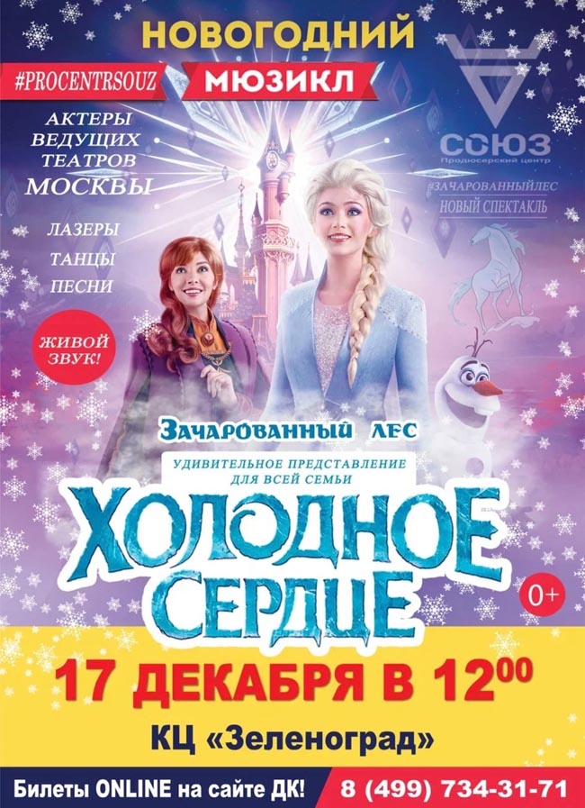 Продюсерский центр «Союз» представит новогодний мюзикл «Холодное сердце» для всей семьи. Вы увидите спектакль в исполнении ведущих актеров московских театров, наполненный полюбившимися песнями (живой звук), веселыми танцами, добрыми шутками и храбрыми подвигами. Яркие объемные декорации, современные технологии и спецэффекты сделают поход в театр незабываемым приключением.
