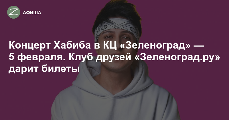 5 февраля в 18:00 на сцене Культурного центра «Зеленоград» состоится концерт финалиста проекта «Песни» Хабиба. Продолжительность — 1 час 15 минут. Билеты от 2000 рублей можно приобрести на сайте.