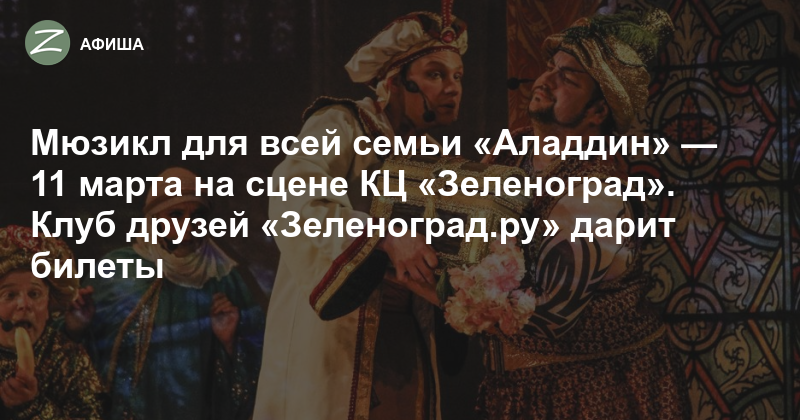 11 марта в 12:00 на сцене Культурного центра «Зеленоград» будет показан мюзикл для всей семьи «Аладдин». Продолжительность мюзикла — 1 час без антракта. Билеты от 700 рублей можно приобрести на сайте. Доступна оплата Пушкинской картой.