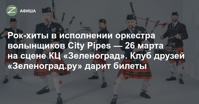 26 марта в 19:00 на сцене Культурного центра «Зеленоград» состоится концерт оркестра волынщиков City Pipes. Продолжительность концерта — 1 час 30 минут без антракта. Билеты от 800 рублей можно приобрести на сайте. Доступна оплата Пушкинской картой.