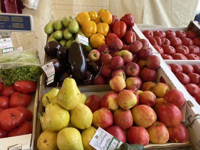 Семь торговых мест под большим тентом расположились у корпуса 1104 (ТЦ «Ольга»), позже их будет 12. В ассортименте: овощи, фрукты, зелень, ягоды. Ценник — средний. Как утверждают продавцы, ниже, чем на Крюковском рынке.
