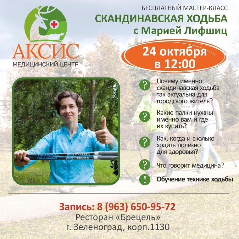 24 октября в 12:00 Медицинский центр «Аксис» совместно с профессиональным инструктором Марией Лифшиц проведут для всех желающих бесплатный мастер-класс по скандинавской ходьбе и чаепитие в уютном ресторане «Брецель». Встреча в ресторане «Брецель» (корпус 1130) в 12:00. Запись по телефону 8(963)650-95-72.