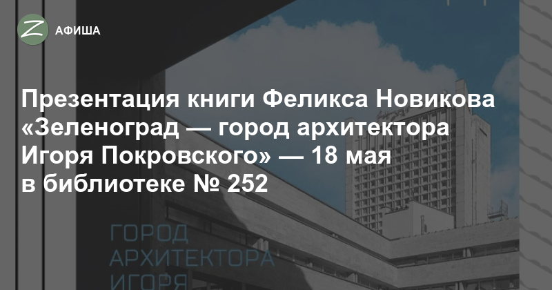 Презентация книги Феликса Новикова «Зеленоград — город архитектора Игоря Покровского» пройдет 18 мая в Библиотеке театра и кино № 252 (корпус 1462). О книге расскажут: Феликс Аронович Новиков — архитектор, теоретик, историк и критик архитектуры, автор целого ряда построек в Москве и Зеленограде (примет участие в презентации по скайпу); Юрий Грошев — архитектор, специалист по советскому модернизму; дочь И.А. Покровского Мария Игоревна и сын Александр Игоревич. Начало в 18:00. Вход свободный.