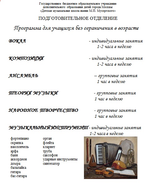 Приём учащихся 6-12 лет на инструменты: фортепиано, скрипка, виолончель, арфа, ударные инструменты, баян, аккордеон, кларнет, труба, флейта, гитара, домра, орган, тромбон, балалайка. Приём документов и вступительные экзамены проводятся с 10 по 20 мая.