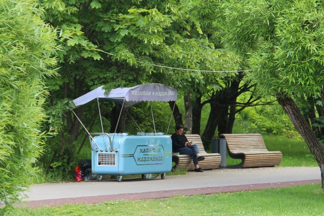 Здесь есть детская площадка, вокруг пруда стоят скамейки, в маленьком домике на воде живут утки.