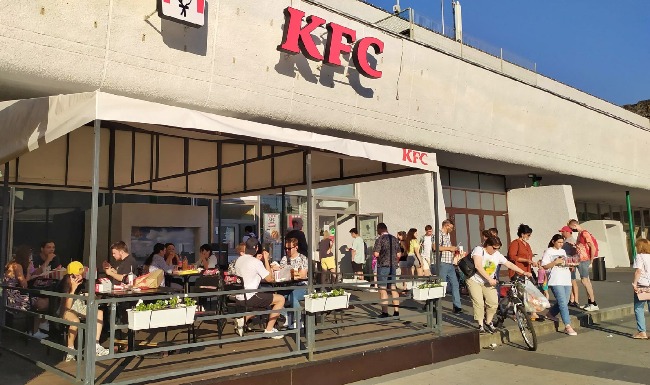 Веранда перед KFC рассчитана на 16 человек. Из украшений на ней можно увидеть разве что небольшие пластиковые горшки с цветами. Но здесь есть всё необходимое для комфортного отдыха: навес накрывает всю площадь террасы, столы не стоят вплотную друг к другу, окружает их невысокий металлический забор.