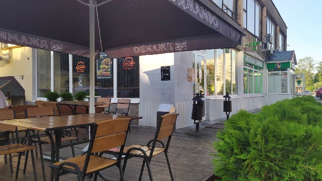 Веранда бургерной «Джамбо» состоит из трёх столов, 12 стульев, деревянного помоста, одного зонтика и двух горшков с маленькими кустиками. Напротив неё — широкий тротуар, слева, как правило, паркуются машины.