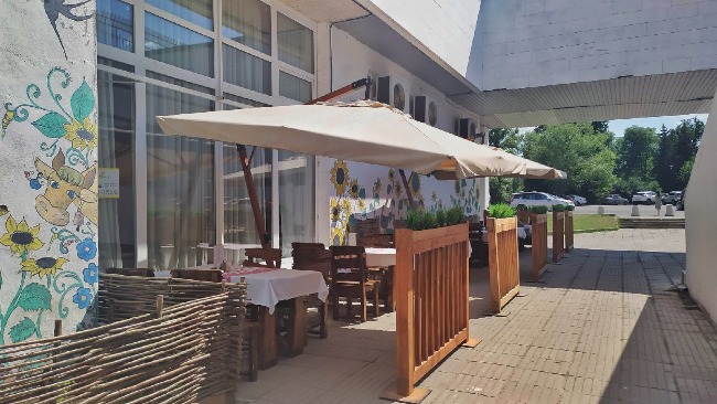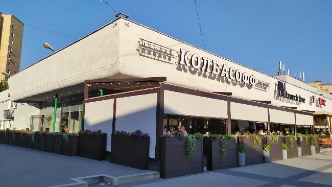 У пивного ресторана «Колбасофф» на площади Юности работает просторная веранда. Она огибает ресторан с двух сторон, а плотный белый навес накрывает её переднюю часть. По всему периметру расставлены высокие горшки с цветами, которые отделяют веранду от площади. Визитная карточка ресторана — большой выбор закусок, мясных блюд и алкогольных напитков.