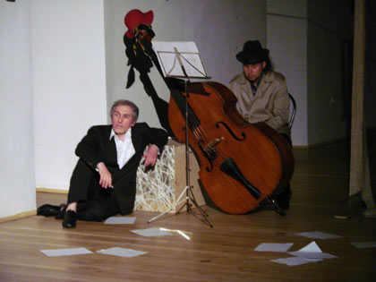 — Это были трудные, долгие поиски. Спектакль существует уже 17 лет. Поначалу это был замечательный дуэт отца и сына: Петр Петрухин-старший и Петр Петрухин-младший — рояль, труба и контрабас. Играли они очень известный джаз. Потом я привез спектакль в Питер на фестиваль «Монокль», и местные критики мне сказали такое, что я задумался — и решил сочинить собственную музыку. Потом появился Вадим Правилов. И я подумал: ведь контрабас — это инструмент, который очень напоминает мужской голос. Мы стали придумывать музыкальную ткань спектакля, которая была бы некой подкладкой к тексту. Ни в коем случае не песней, а ритмической подкладкой. И я придумал образ, потому что всегда надо найти образ — в театре, в музыке, в сценографии. Это был образ жерновов времени, которые перемалывают человека в труху. Если человек не сопротивляется, его эти жернова убивают. К этому меня подтолкнула фраза Бродского: «Больше всего меня интересует борьба человека со Временем…» Как показать жернова времени? Мы придумали такой скрипучий звук, словно поезд разгоняется, и я дублирую его голосом. Где-то Вадик чуть обозначает знакомую мелодию, где-то звучит Бах, чтобы дать зрителю возможность отдохнуть, но в основном это импровизация.