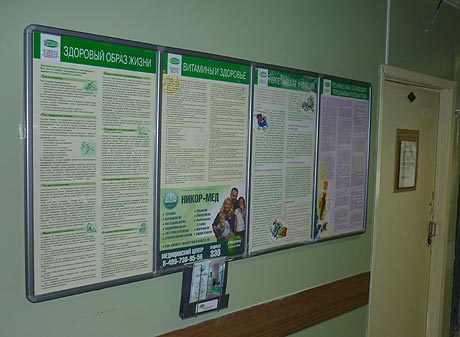 — Мы можем предоставить несколько вариантов на выбор заказчика. Плакаты форматов А1, А2 и А3 (они отличаются размерами). Стендовый карман для листовок, размещение рекламного ролика на плазменных экранах. Плакаты помещаются в стенде, состоящем из четырех секций, рядом с кабинетами врачей. Как правило, к рекламному модулю примыкает социальная реклама по той же или смежной теме. Это очень удобно и, безусловно, полезно, поскольку в социальной рекламе зачастую поднимаются вопросы здоровья, которые можно решить с помощью той или иной услуги и товара заказчика. Мы рекомендуем серьезно подойти к выбору сопутствующей социальной темы, и к тому же — это совершенно бесплатно.