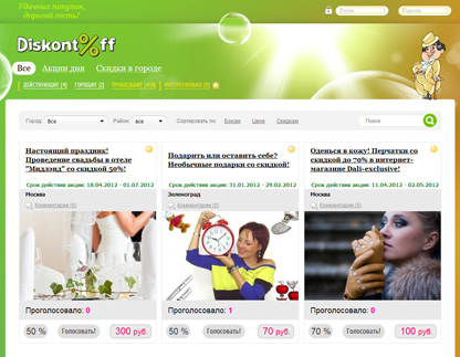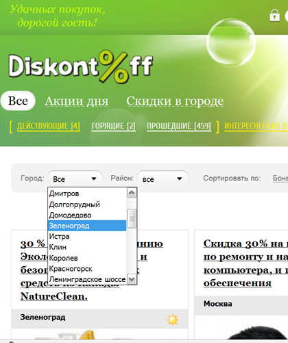 Большинство «купонных сервисов» предлагают услуги больших городов России и это не совсем удобно для городов спутников, ориентируясь на это восстановил свою работу давно радующий Вас «купонный сервис» DISKONTOFF.RU, ориентируясь на жителей Подмосковья и предлагая услуги рядом с домом.