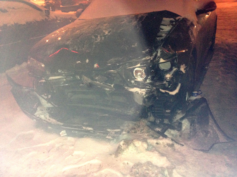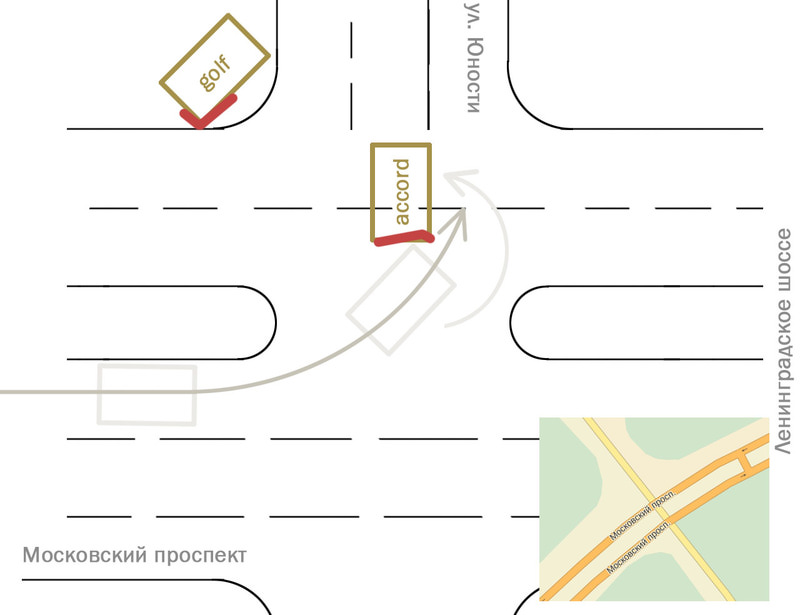 Когда загорелся мой сигнал я начал поворот. В это время в левом ряду встречного направления машины уже остановились, правый ряд был пустой. Моя машина довольно тяжелая и на дороге в это время была снежная "каша", так что скорость я набирал медленно. Когда практически проехал левый ряд встречного направления, боковым зрением заметил справа от себя быстро движущийся объект темно-красного цвета. Раньше я заметить просто не мог, так как машины в левом ряду стояли со включенными фарами и разглядеть, что то за ними было очень сложно. "Гольф" вылетел из правого ряда и в тот момент,когда я нажал на тормоз, практически сразу произошло столкновение. Мою машину развернуло на месте на 180 градусов, сработали все 6 подушек безопасности. В моей машине все были пристегнуты, но жена, которая сидела на пассажирском сидении, получила сильный удар(или два) в правую часть лица и лоб. Возможно от выстрелившей подушки безопасности.