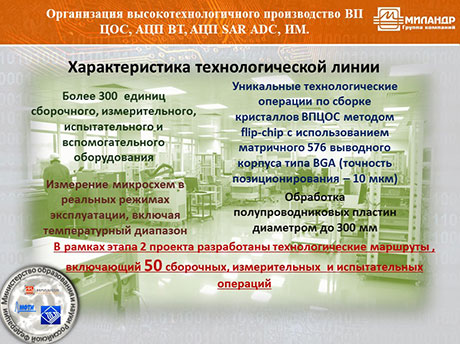 В.С. — Проект рассчитан на 2013-2015 годы. В настоящее время мы завершили этап, связанный с эскизным проектированием АЦП, ВПЦОС и ИМ. В мае 2014 года будет завершено техническое проектирование и изготовлены первые экспериментальные образцы изделий. В 2014—2015 году запланирована разработка рабочей документации, формирование и запуск технологической линии, изготовление опытных образцов как микросхем, так и модулей. В рамках проекта у нас введено в эксплуатацию 650 кв. метров производственных площадей, только в реконструкцию которых «Миландр» уже дополнительно вложил более 7 миллионов рублей. Кроме того, дополнительно планируется приобретение измерительного, испытательного и сборочного оборудования. Общая сумма инвестиций в закупку оборудования только в рамках выполняемого проекта составит более 60 миллионов рублей. В течение 2015 года завершится монтаж оборудования, пройдёт аттестация технологической линии и комплекса испытательного оборудования. После завершения испытаний опытных образцов мы предъявим проект Госкомиссии.