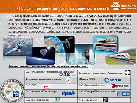 В.С. — Да, кооперация предприятий реального промышленного сектора и вузовской науки нацелена на «подтягивание» выполняемых научных разработок вузов к производственным и, в конечном счете, к коммерческим задачам. При этом кроме тех средств, которые выделяются по госсубсидии, предприятие, в данном случае «Миландр», обязано вложить в проект столько же собственных средств. Мы в рамках проекта запускаем технологическую линию производства высокопроизводительных процессоров цифровой обработки сигнала, аналого-цифровых преобразователей высокой точности и интегрированных модулей на их основе для создания транспортных, авиационно-космических и энергетически систем. Планируется разработать два типа аналогово-цифровых преобразователей (АЦП), высокопроизводительный 32-разрядный процессор цифровой обработки сигналов (ВПЦОС) с тактовой частотой 400 МГц, а также интегрированный модуль цифровой обработки сигналов (ИМ) на основе комплекта ВПЦОС и необходимое программное обеспечение для этого модуля.