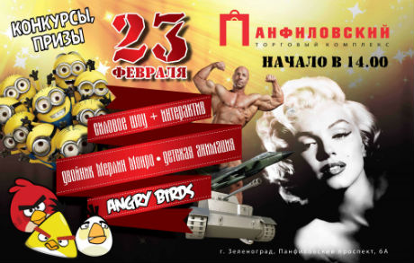 — Торговый комплекс «Панфиловский» поздравляет с Днем защитника Отечества — любви, оптимизма и благополучия нашим мужчинам! 23 февраля в 14:00 мы ждем всех на нашем празднике, где можно будет стать не только зрителем, но и участником захватывающего экстремального силового шоу. Поможет восстановить силы и вдохновит на новые подвиги секс-символ ХХ века — двойник Мэрилин Монро. Участников праздника ждут, как обычно, призы и подарки!
