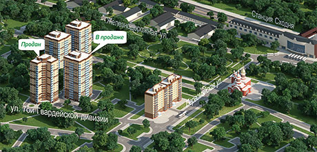 Компания MEBE group сносит и расселяет ветхие пятиэтажки в Сходне. Вместо них уже построена 17-этажная башня на 119 квартир (ЖК «Гвардейский») и 15-этажный дом на 222 квартиры (ЖК «Горный»).