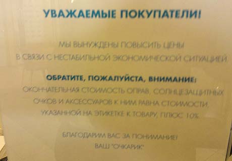 Подорожание затронуло и непродовольственные товары. От экономической нестабильности магазины страхуются кто как может. К примеру, зеленоградский салон оптики, предупреждает покупателей, что окончательная стоимость товара равна сумме на этикетке плюс 10%.