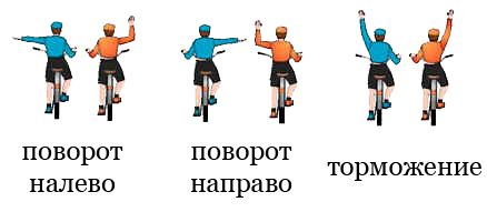Перед началом движения, перестроением, поворотом и остановкой велосипедисту нужно подавать сигналы рукой. Сигналу левого поворота соответствует вытянутая в сторону левая рука либо правая, вытянутая в сторону и согнутая в локте под прямым углом вверх. При повороте вправо — наоборот. Сигнал торможения подается поднятой вверх левой или правой рукой.