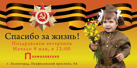 — Торговый комплекс «Панфиловский» поздравляет ветеранов Великой Отечественной войны и всех зеленоградцев с этим великим праздником. Конечно же, мы не можем остаться в стороне, и по традиции подготовили целую программу, которая, надеюсь, будет интересна всем. Приглашаем всех, праздник начнётся в 12:00 возле торгового комплекса!