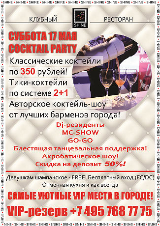 Суббота, 17 мая: Cocktail PARTY — всю ночь коктейли по 350 рублей!