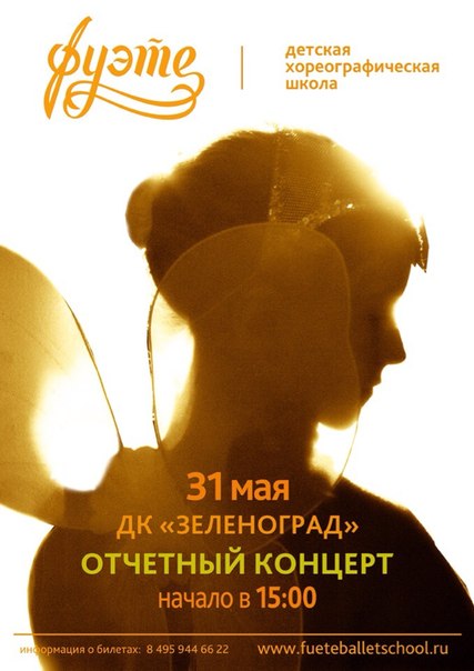 31 мая в 15:00 в театральном зале культурного центра «Зеленоград» состоится отчетный концерт хореографической школы «Фуэте». Заказ билетов по телефону: 8(495)944-66-22.