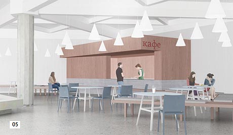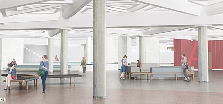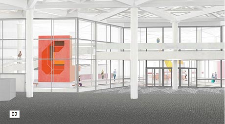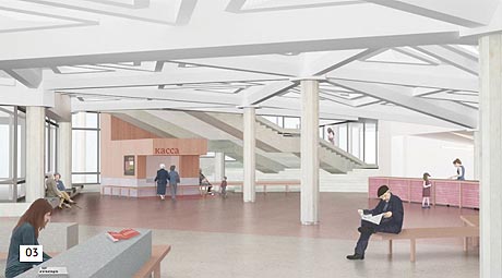 Концепция нового дизайна — обновление главного входа и его взаимосвязь с атриумом, создание зон свободного пространства в фойе. Сейчас главный вход закрыт из-за ремонта, а после открытия в центре фойе появится стойка ресепшена, которая разделит его на смежные пространства. Здесь будет киоск для проката книг и журналов, новая нестандартная мебель. Турникеты у служебного входа уберут. Бесплатный коворкинг, работающий сейчас на летней веранде ДК, будет в верхнем фойе.