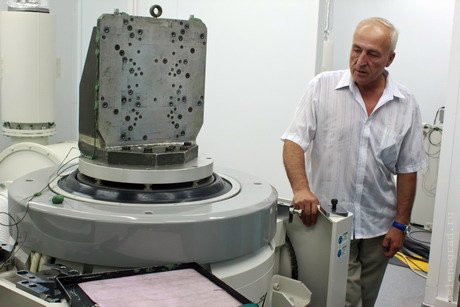 Ударный стенд: внизу сейсмомасса, наверху — рабочий стол. К стенду прилагаются разнообразные прокладки, с помощью которых регулируют силу и длительность удара. Максимальный — в 10000g, это настоящий «апокалипсис», который намного превосходит прямое попадание снаряда в броню. В реальных испытаниях на нём пока пробовали до 3000g для одного из приборов. Стенд сделан с США и стоит полмиллиона евро, в России таких единицы.