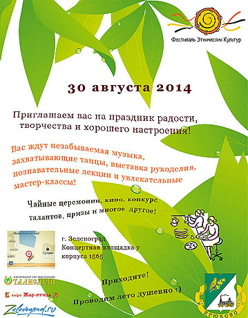 На нескольких площадках работают мастер-классы. Это изготовление старинных украшений из меди и латуни, природных материалов, резьба по камню, витражная роспись, живопись, выпиливание лобзиком и выжигание по дереву, украшения и сувениры в технике фьюзинг; мастер-классы по йоге на отдельной площадке. Работает выставка рукоделия, где можно посмотреть различные поделки, украшения, одежду и сувениры, в том числе из зерен кофе и семян пальмы. Зеленоградская школа аргентинского танго покажет танцевальный номер. Также посетителей ждут чайная церемония и японская медидативная музыка.