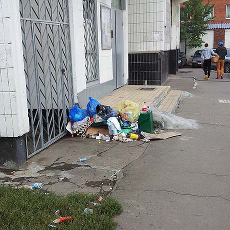Сейчас работают люди славянской внешности, на улице перед подъездом урна переполнена и вокруг нее приличная кучка мусора. Рядом с дверью в помещение, куда мусор сваливается, тоже есть немного мусора и мне не понятно кто и зачем туда сваливает мусор, если можно отнести в баки мусорные, которые находятся в 100 метрах. А некоторые еще оставляют свои мусорные пакеты рядом с мусоропроводом. Понятно, что мусоропровод забит, но блин, можно спуститься, пройти 100 метров и оставить рядом с переполненными контейнерами.