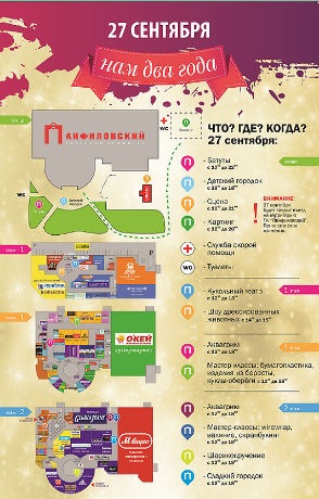 — По случаю дня рождения ТК — скидки и подарки. В магазине «Ларес» продолжается ярмарка фарфора и фестиваль текстиля. Открылся новый салон обуви Mio. А в октябре начнёт работать косметологический салон"Совершенство". А парк развлечений BoomZoom продолжает радовать своей традиционной акцией «Игрушка месяца». В октябре призотека пополнится эксклюзивными игрушками из таких компьютерных игр, как Minecraft, Mario, Assassin Creed и Cuttherope.
