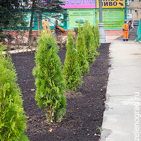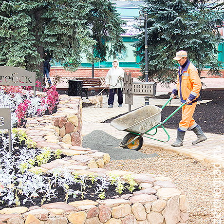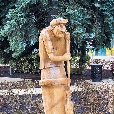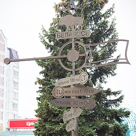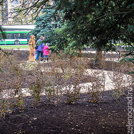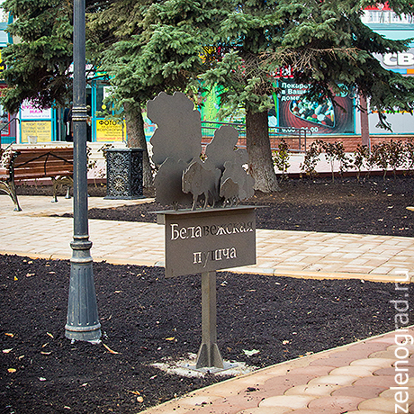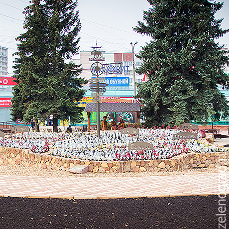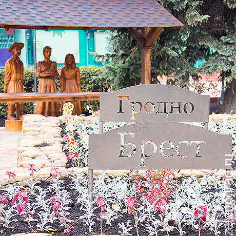 Бывшая клумба перед вторым торговым превратилась в небольшой парк с деревянными скамейками, скульптурами, пешеходными дорожками и табличками с названиями городов — в знак российско-белорусской дружбы.