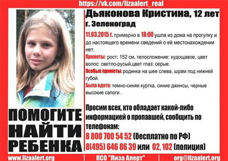 Родственники Кристины Дьяконовой просят связаться с ними всех, кому что-либо известно о местонахождении девочки: 8(903)256-86-81Валентина; 8(929)901-54-71 Вера.