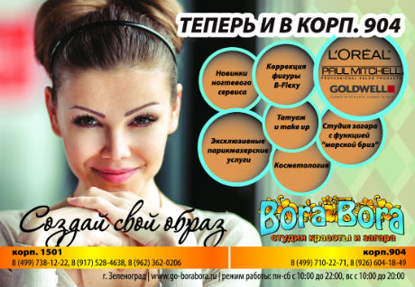 Мы — единственные среди салонов красоты Зеленограда, где Вы можете сделать химическую завивку «Evolution Goldwell» или элюменирование волос «Goldwell», а также посетить самый мощный солярий марки «Sunflover», обеспечить своим волосам комплексный уход и лечение от мирового бренда «Loreal», сделать эксклюзивный макияж или татуаж. А может быть, Вы хотите побаловать себя сеансом массажа, заказать комплексную коррекцию фигуры, европейский и даже азиатский маникюр и педикюр или сделать близким сюрприз в виде подарочного сертификата? И даже если Вы ищите детскую парикмахерскую в Зеленограде, то мы сможем Вам помочь, ведь студия красоты г. Зеленоград превращает стрижку малыша в забавное приключение на острове Бора Бора. Окунись в бесконечное лето прямо здесь и сейчас, ведь солнечный пляж уже ждет Вас по еще одному адресу: г. Зеленоград, корпус 904 (бывшее помещение салона «Fleur de Mary».